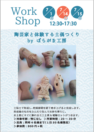 有楽町マルイで6/19~7/15に開催のpop-up shop「つくりえの涼風のクラフト」でワークショップを行います!「陶芸家と体験する土偶つくり!by ぼらがま工房」土粘土で形成し、乾燥期間を経て焼き上げると完成します。この日は形成後のものをふんわり包んでお... -