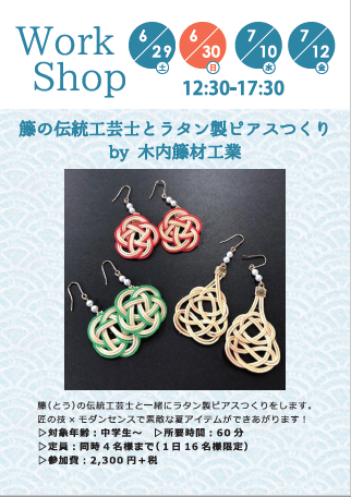 有楽町マルイで6/19~7/15に開催のpop-up shop「つくりえの涼風のクラフト」でワークショップを行います!「籐の伝統工芸士と一緒にラタン製ピアスつくり!by 木内籐材工業」籐(とう)の伝統工芸士と一緒にラタン製ピアスつくりをします。匠の技×モダンセ... -